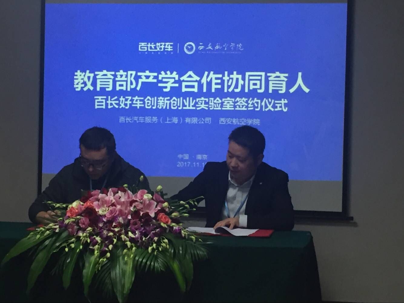 2017年11月15日,来自全国6所高校的7位代表、德国纽汀根-格瑟林经济与环境大学Wolfram Sopha教授、中华全国工商业联合会汽车经销商商会秘书长朱孔源及部分企业代表,在南京农业大学见证了高校与百长汽车服务(上海)有限公司签订教育部产学合作协同育人百长好车项目-共建创新创业实验室战略合作协议。