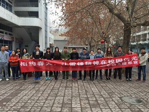 3月5日,为响应向雷锋同志学习的号召,继承发扬雷锋精神。车辆与医电工程系团总支举办了系列学雷锋志愿者活动。中午在第一综合食堂前隆重进行了“相约春天,让雷锋精神在春天闪耀”为主题签名活动,下午在公司离退办进行卫生清洁活动.