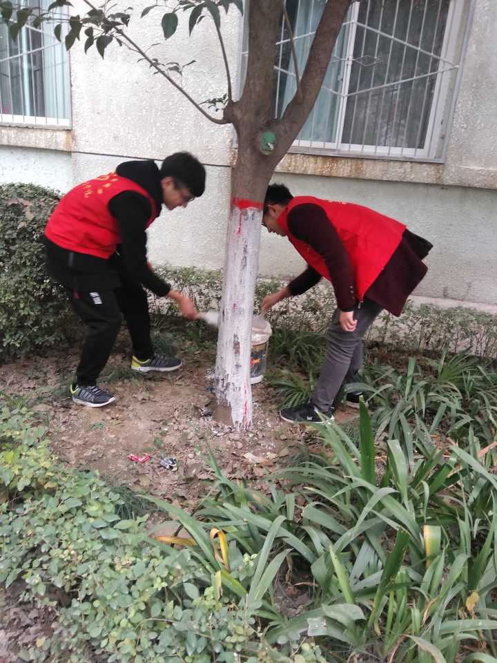 首先,志愿者们分发了油漆、石灰、刷子以及水桶等相关用品,并进行了合理分工。随后,志愿者们仔细耐心地为校园的树木进行粉刷。在活动过程中,他们不怕累,不怕脏,积极传承和发扬了青年志愿者吃苦耐劳的精神。