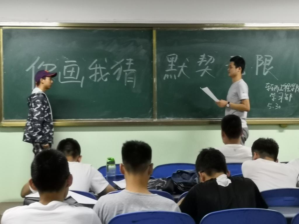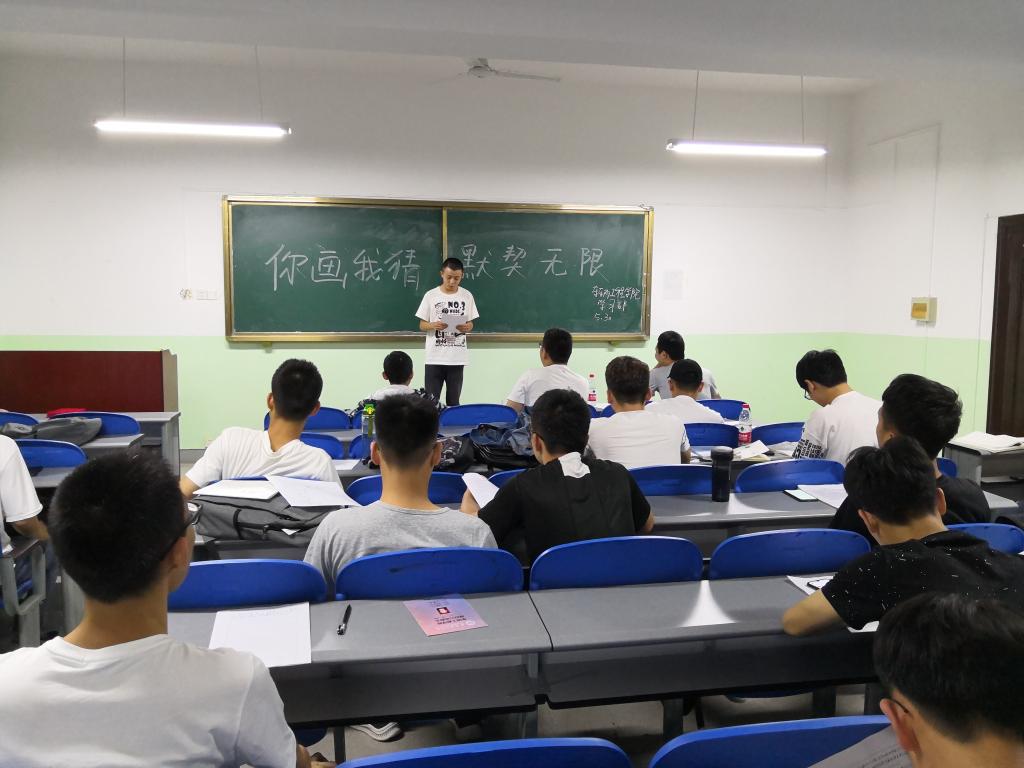 本次活动内容为负责画画的同学在词语组中抽取一个词语,并由工作人员向大家展示,给猜词的同学字数提示。画画的同学在纸上绘画图案,图案不得出现文字信息。最后交由猜词选手猜答案,并写出答案。现场气氛十分活跃,同学们踊跃参与。
