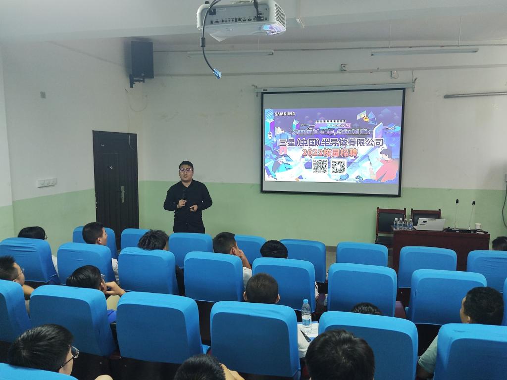 首先,三星公司人事经理代航为毕业生介绍了关于我们和生产情况。并从多方面向同学们展示了公司顶级的技术,增强同学们对于企业的认识度。