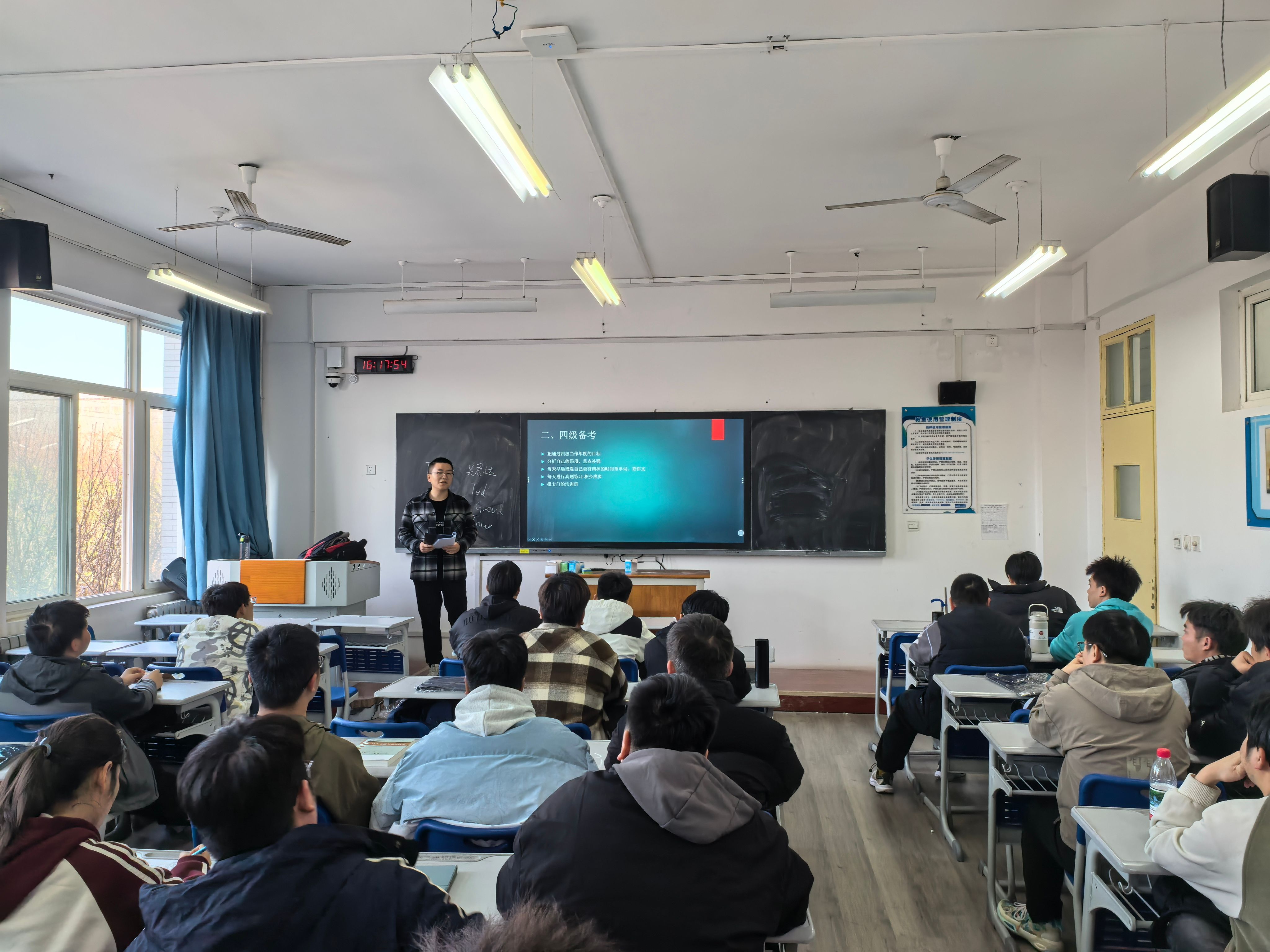 本次活动聚焦英语四级考试能力提升,刘珉典老师从试卷结构、题型分布、评分标准三大维度切入,结合近年真题和高频考点,着重解析了作文、听力、阅读理解和翻译的复习方向和做题方法。