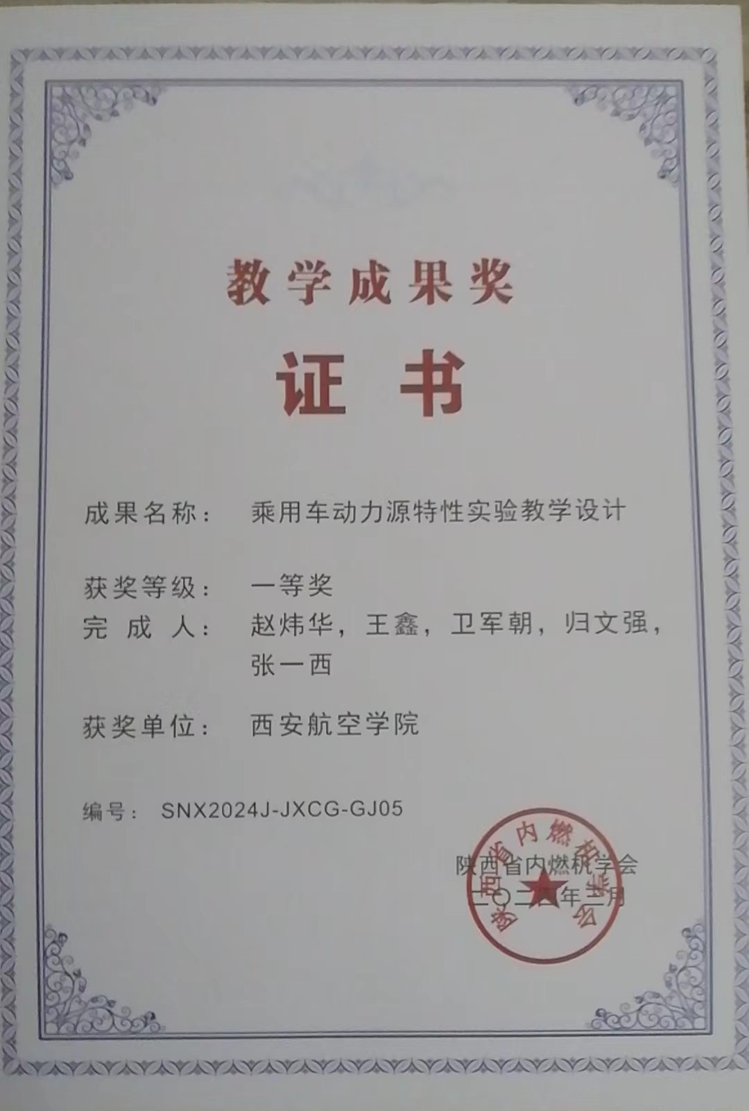由公司赵炜华教授作为第一完成人、公司作为唯一完成单位的《乘用车动力源特性实验教学设计》项目获2023年陕西省内燃机学会教学成果奖一等奖。